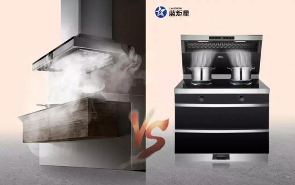 ▲傳統油煙機vs藍炬星集成灶側吸下排